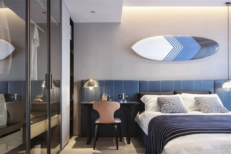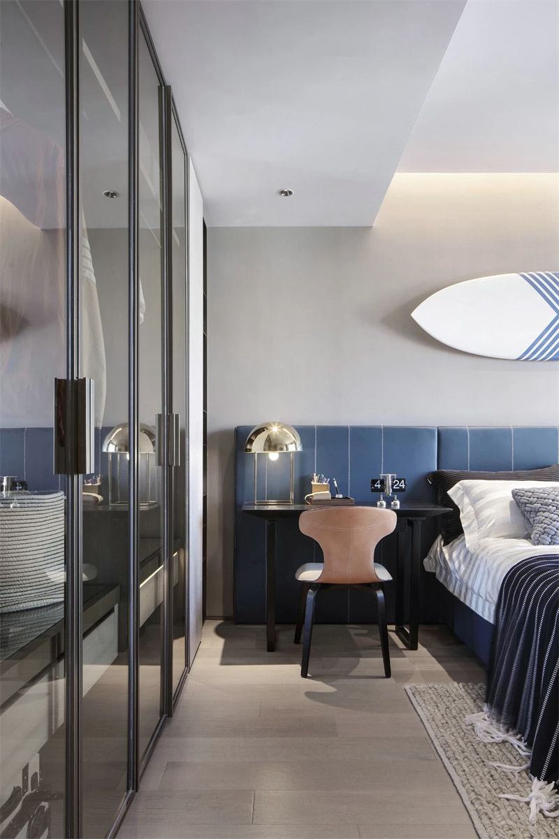 次臥以淺灰色為主色調(diào),搭配柔和的天藍(lán)色軟包床頭,給人一種溫馨時(shí)尚、舒適優(yōu)雅的視覺體驗(yàn)。玻璃門衣柜是亮點(diǎn),令所有衣物都明朗地呈現(xiàn)在眼前,讓收納從雜亂無章變得井井有條。