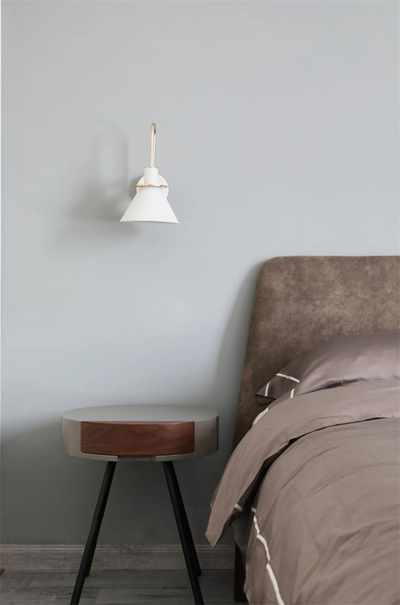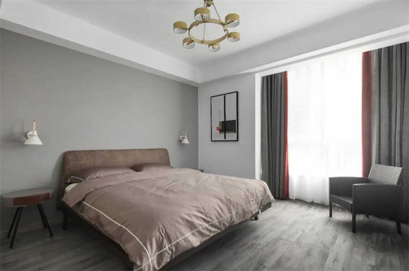 主臥簡約舒適,灰色木地板搭配淺色墻面,營造出寧靜放松的氛圍。深棕色軟包大床搭配同色系床品,溫暖協調。床頭兩側設有壁燈和小凳,方便實用,墻上一幅抽象畫增添藝術感,整體空間實用又溫馨。