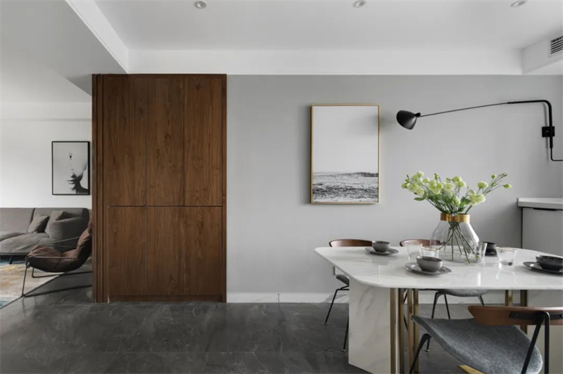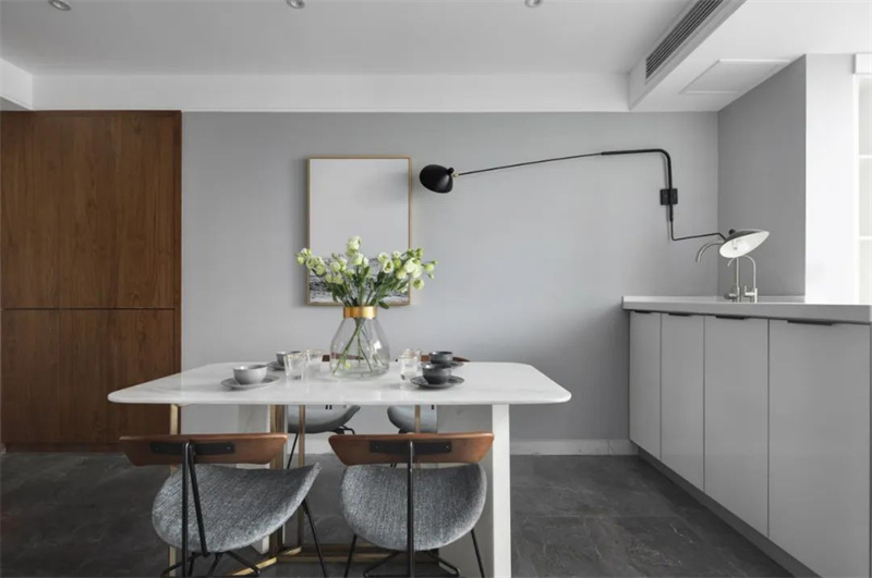 餐廳白色餐桌配灰色布藝餐椅,舒適又耐看,桌上的花束和餐具點綴出生活氣息。墻上的藝術畫和黑色壁燈提升了空間質感,木質儲物柜則增添了一絲自然溫暖。大窗戶引入自然光,讓整個區域明亮舒適,兼具美感與實用性。
