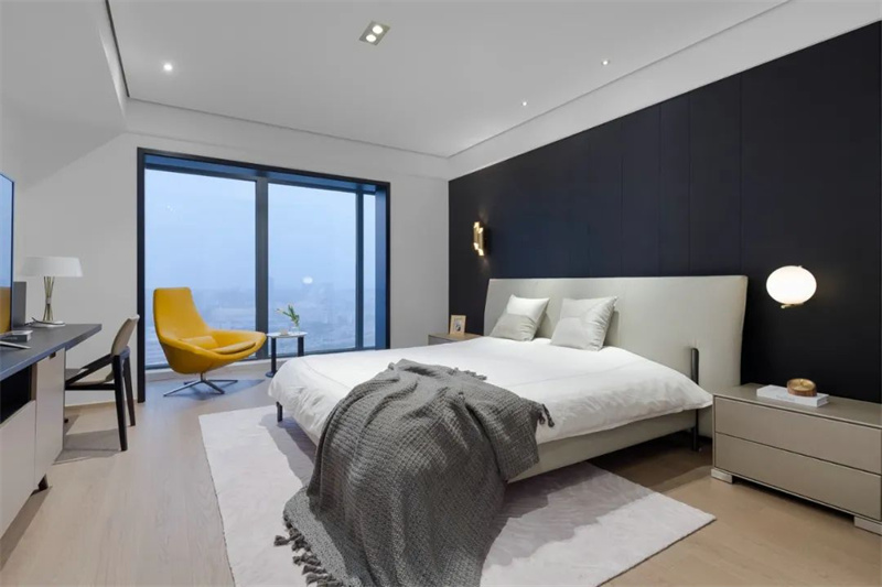 主臥以簡潔線條和低飽和色調,營造出寧靜舒適的睡眠氛圍。落地窗引入充足采光,視野開闊,連接室內外的寧靜時光。一側設置小型工作角,書桌搭配亮色單人椅,兼顧實用與設計感。床頭壁燈、香薰與裝飾擺件點綴其間,細節中透露著生活溫度。