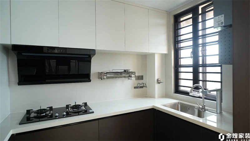 廚房整體采用黑白搭配,營造出整潔利落的視覺效果。U型布局讓空間利用率最大化,操作流暢且方便。嵌入式的廚電設計進一步優化了空間,簡約的設計不僅讓廚房看起來明亮,也提升了烹飪時的舒適感。