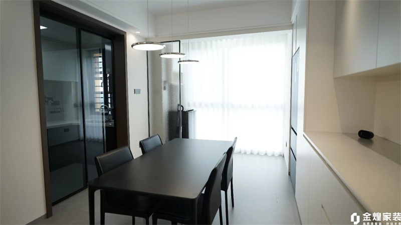 餐廳整體空間充足,居中擺放一套舒適的木質餐桌搭配皮質餐椅,讓用餐氛圍輕松閑適。一側的餐邊柜設計與擺設,兼具了裝飾與收納功能,讓空間更加整潔協調。