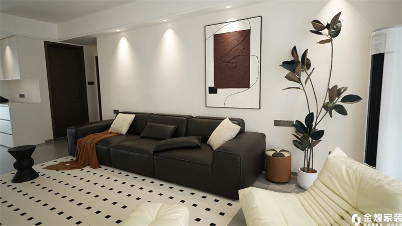 客廳主色調采用白色墻面與灰色大理石地磚搭配,創造出通透明亮的空間感。以低調的深色調沙發展現簡約品味,通過一些精致的極簡設計裝飾畫和空間擺件,為整個客廳注入一絲藝術氛圍。