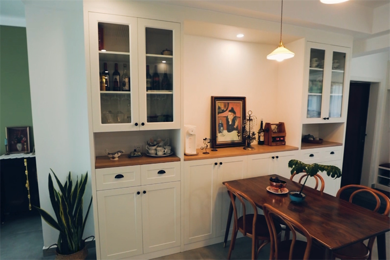本案客餐廳以灰、白、果綠為主,自然、安靜、舒適,整體硬裝少而精,軟裝+綠植豐富整個空間,讓房子生動起來,像植物園一樣有生機,更讓整個空間鮮活起來。每次回到家都是一次心靈的放松,沙發背景采用一組簡約美觀的裝飾畫,配上清新的綠植,點亮了空間的文藝與清新。