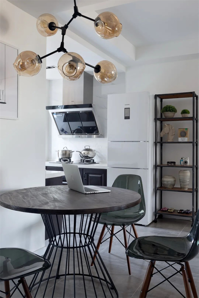 廚房臨窗而設,讓整個廚房保持明亮干爽的空間,以白色大理石紋理墻磚+灰色地磚組合,結合深色定制櫥柜,在U型的操作臺下,裝扮出了一個舒適時尚的烹飪空間。