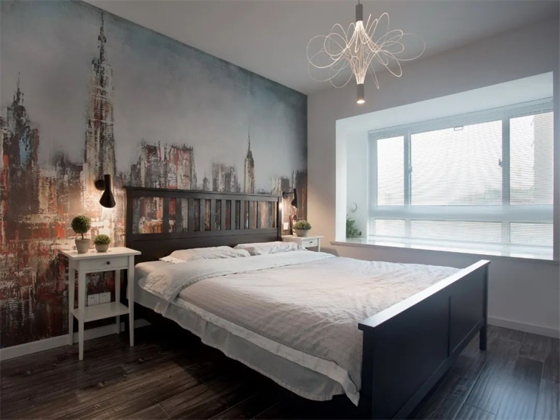 主臥室以白色墻面為主,床頭背景墻繪制大幅藝術畫,為空間增添藝術氣息。大窗戶帶來了足夠的自然光線,使臥室更加明亮。簡約的原木床加上深色地板與白色飄窗臺,簡簡單單的空間,充滿了輕松與自然的質感。