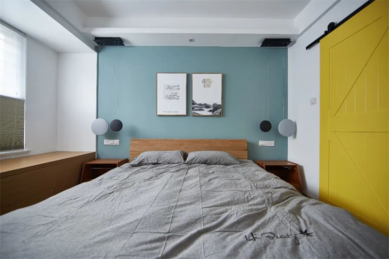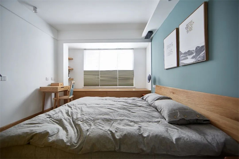 主臥室墻面是明亮的白色,藍(lán)色的床頭背景與灰色的床品組合,加上原木地板和實(shí)木家具,給空間帶來清新的自然感。主臥室的照明設(shè)計(jì)考慮到了夜間舒適的用光需求,包括床頭臺燈和壁燈,打造完美的休憩空間。