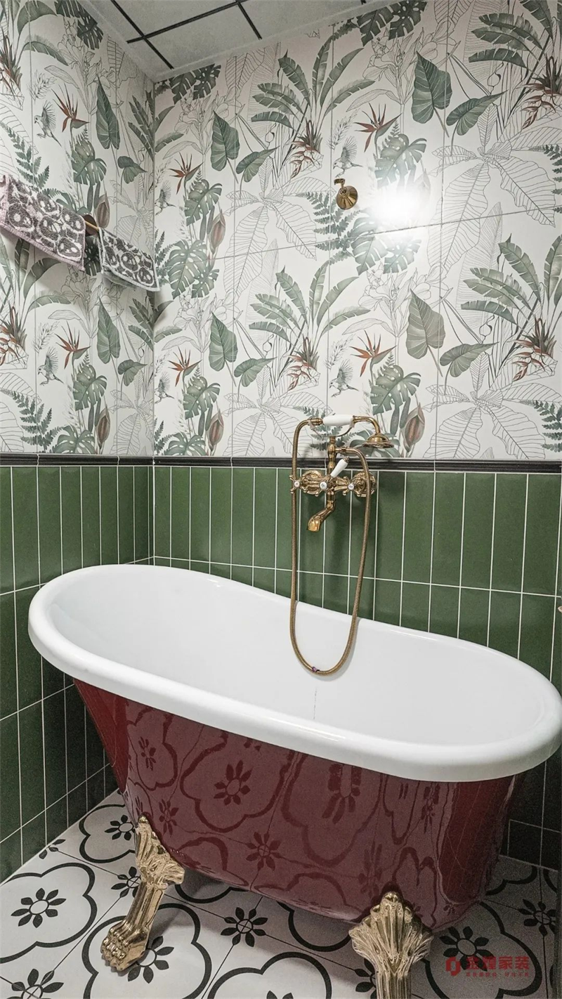 為提高空間利用率,衛生間做了干濕分離設計。洗手臺墻面為大面積藝術壁畫,在鏡面燈的襯托下看起來格外溫馨,使空間更加優雅復古。