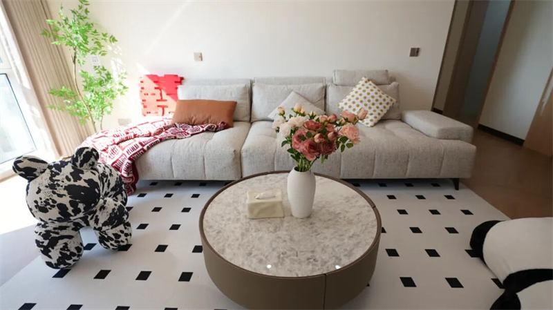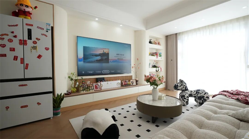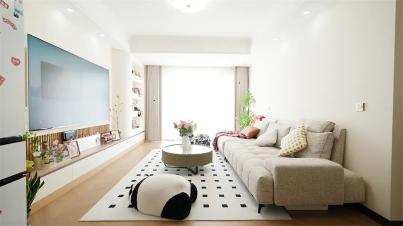 客廳里,米白沙發搭配幾何地毯,點綴一抹紅喜字與熊貓玩偶,傳統與童趣悄然融合,讓家在簡約中透出滿滿溫度與個性。這不僅是一次裝修,更是一種松弛而有愛的生活方式的開啟。