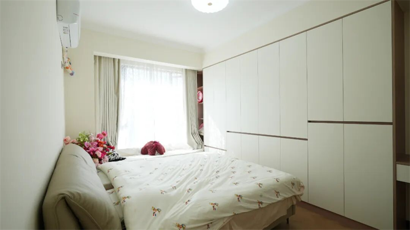 主臥以極簡線條勾勒出寧靜的休憩空間,延續原木奶油風的溫柔基調,營造出如云朵般輕盈的睡眠氛圍。通頂式奶油白衣柜搭配淺木色邊框,簡約而不失設計感,巧妙隱藏收納,讓空間整潔有序。床品選用清新印花圖案,點綴一抹童趣與生機,與窗邊一束鮮花相映成趣,喚醒生活的詩意。