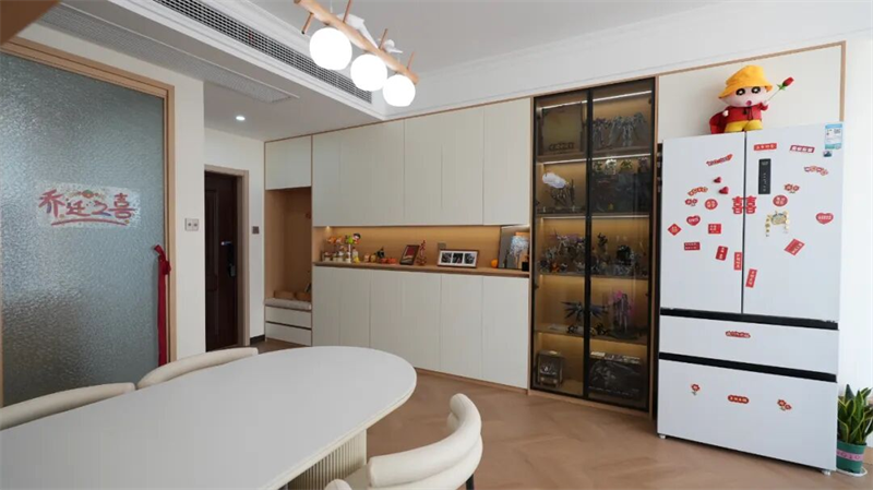 原木奶油風的基調延續至餐廚區域,開放式餐邊柜設計巧妙融合收納與展示功能,暖光燈帶點亮每一處細節,讓日常用品也擁有詩意的陳列。圓潤的白色餐桌搭配柔軟坐墊椅,營造輕松圍坐的溫馨氛圍;一旁冰箱貼滿喜慶紅標與可愛貼紙,洋溢著新居的喜悅與煙火氣。